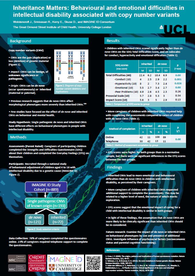 Methods: The Strengths and Difficulties Questionnaire (SDQ) and the Everyday Feelings Questionnaire (EFQ) were administered to caregivers of children with CNVs. The SDQ is a validated measure which assesses common areas of emotional and behavioural difficulties. The EFQ is a self-report measure which assesses the emotional wellbeing of children’s caregivers. Participants were recruited by the IMAGINE ID Study, which comprises children with ID of genetic aetiology.