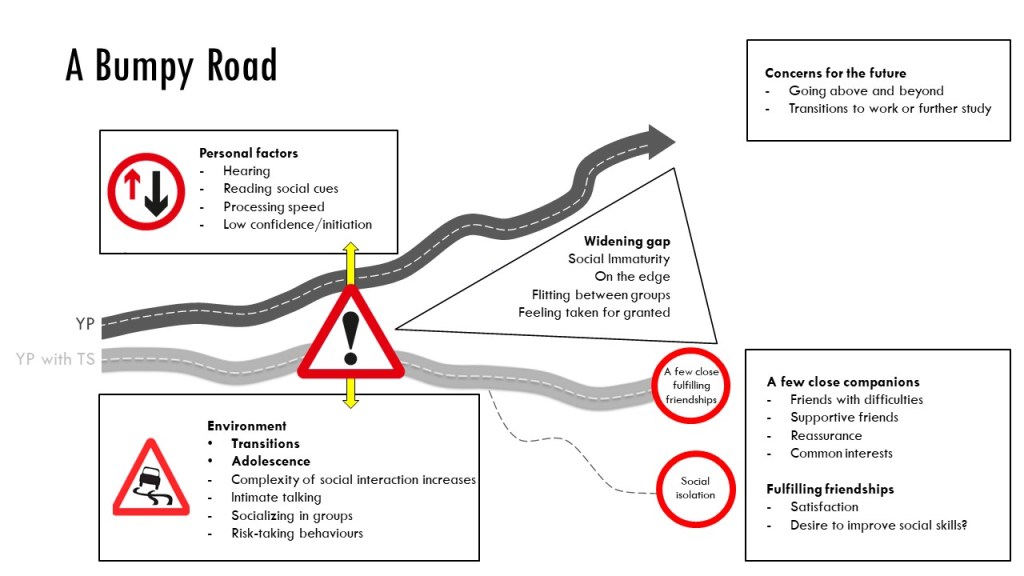 Young women with TS experienced a “wide range of social competencies,” ranging from a few close fulfilling friendships to social isolation. Most had experienced difficulties with friendships growing up. They attributed social challenges to “personal and environmental factors.” The personal factors included difficulties reading social cues and body language, understanding humour, hearing adequately, and paying attention, whereas their parents highlighted differences in attitudes towards socialisation. The key environmental factor was going through adolescence. Adolescence marks the beginning of a developmental period where the complexity of socialisation increases. The magnitude of these challenges to social integration intensified during adolescence. They felt increasingly “out of sync” with their peers as the “gap widened”. Parents were concerned for their daughters futures, especially in regards to being taken advantage of socially and managing new social challenges at work or in further education.